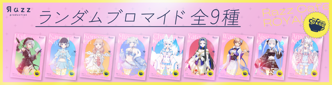 RazzプロダクションのROYALライバーが出演するコラボカフェ企画「らずカフェ☆ROYAL」にて、出演する9名のROYALライバーのブロマイドを販売します。
